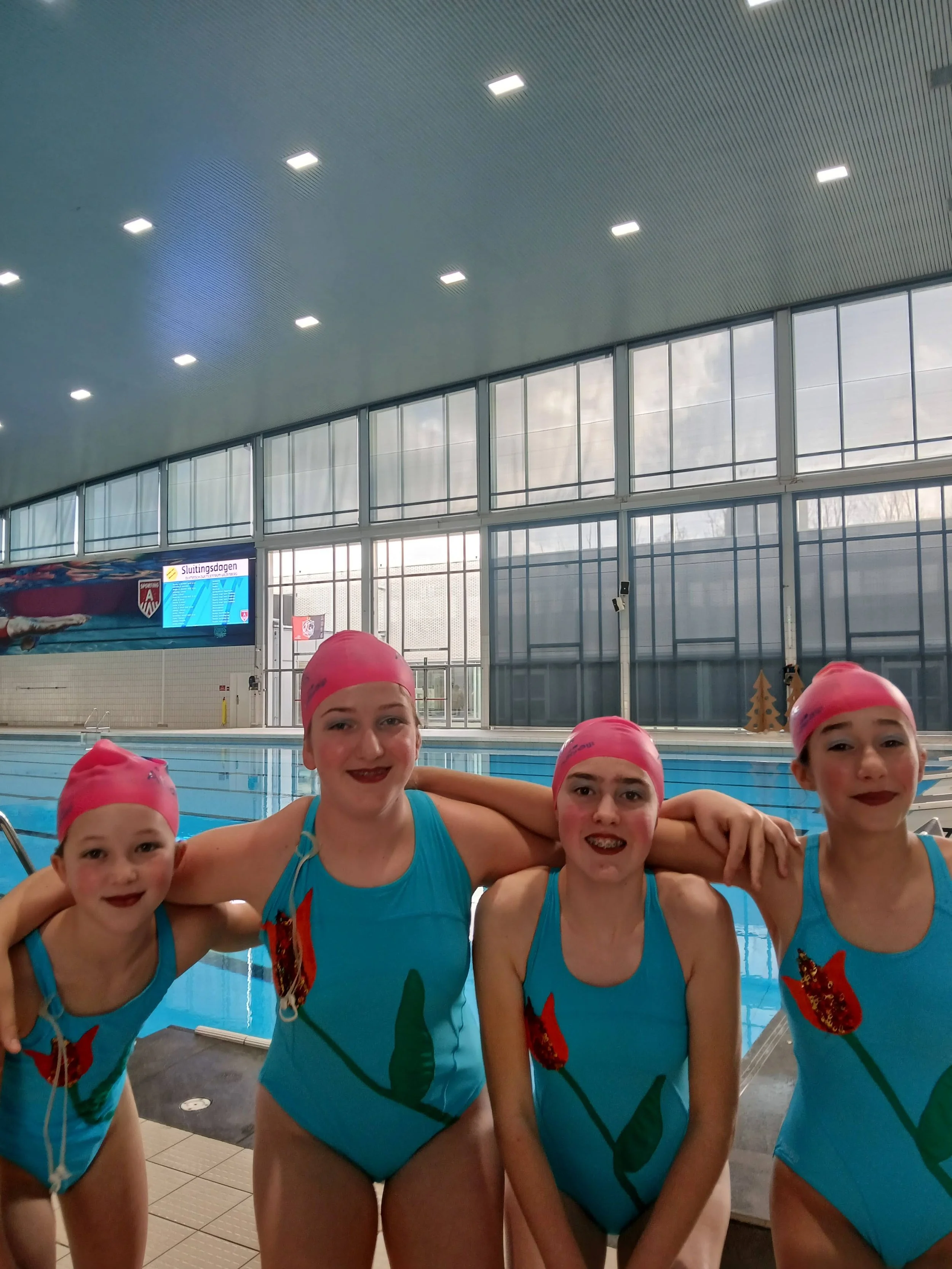 We brachten de feestelijke sfeer tot leven met onze choreografieën en bewegingen, en het was ongelooflijk om te zien hoe het publiek genoot van ons harde werk! ❄️💫 Het was een namiddag vol glitter, muziek en natuurlijk – veel zwemplezier!